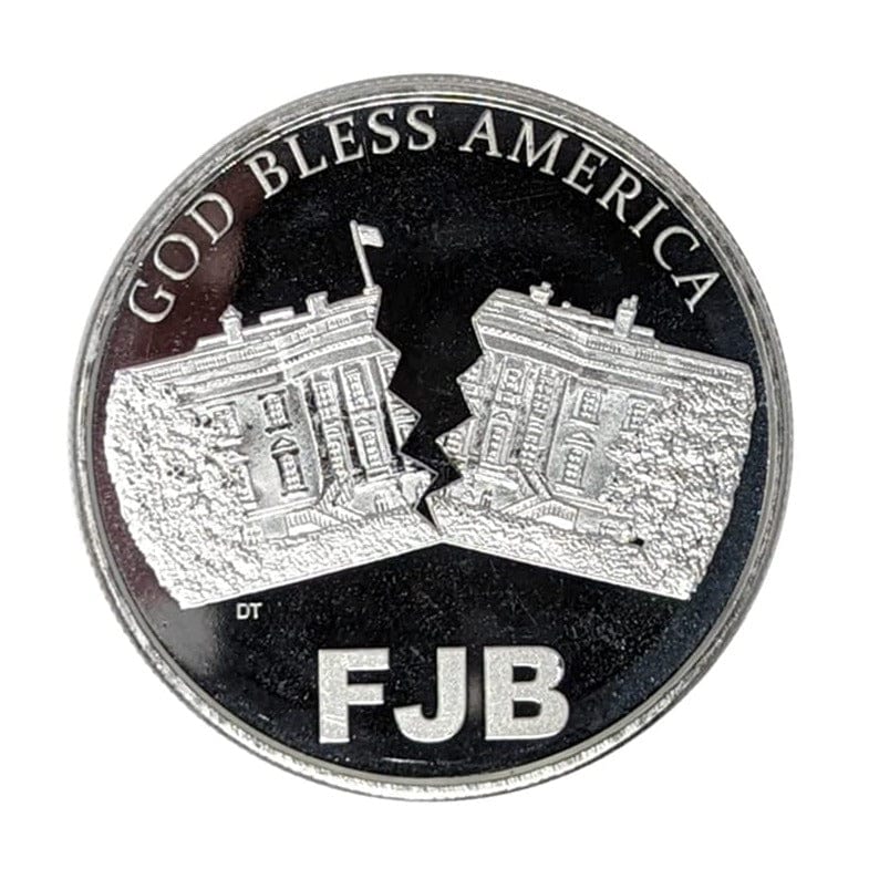 Let's Go Brandon Pure Fine Silver Coin FJB Bullion Coin Image of Reverse shows purity stamp. Let's Go Brandon Obverse. FJB with Broken White House Reverse. Proof Like Finish. Image is Stock Photo.