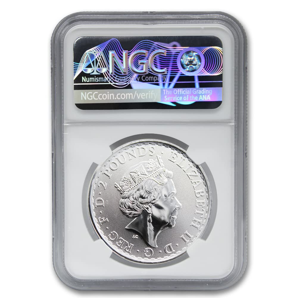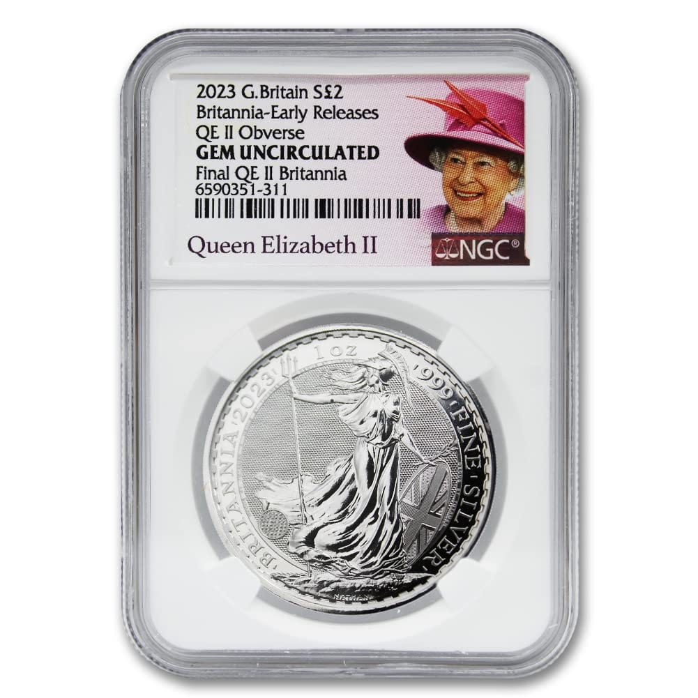 2023 1 oz British Silver Britannia Coin by the Royal Mint Gem Uncirculated (Early Releases - Final Queen Elizabeth Label) 2£ GEMUNC NGC