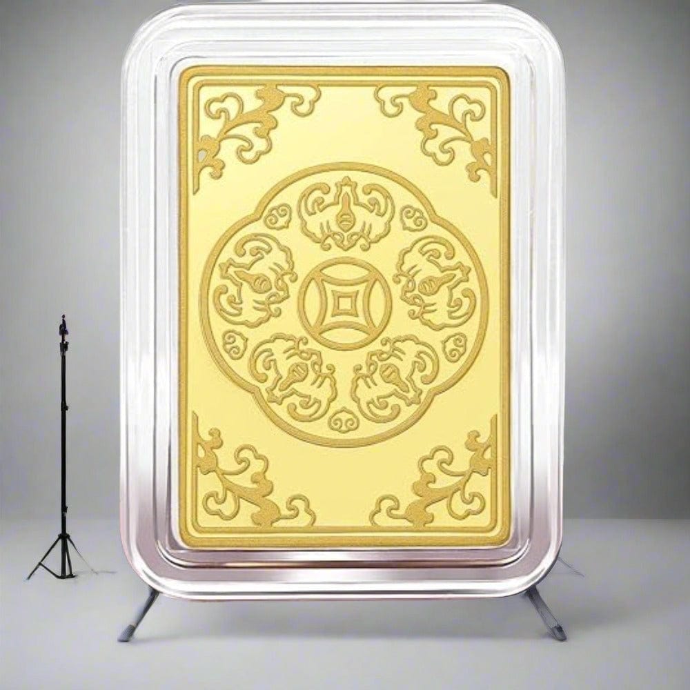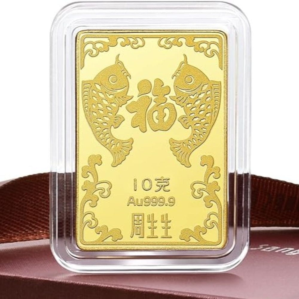 Carry blessing and more. The gold ingot stamps a lively Koi fish image over polished and matte-finished gold. It features them in paper-cutting style with Chinese characters "福"(fortune) & an auspicious pattern with bats & ancient coins at the back.